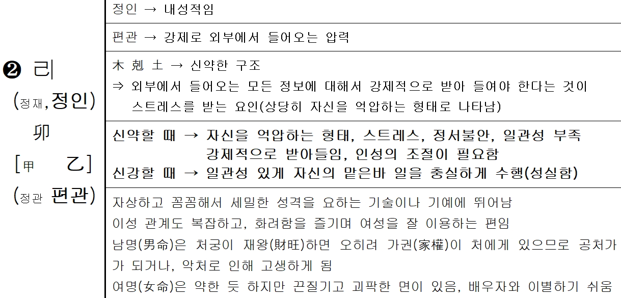 기묘일주는 드러난 성향은 기본적으로 정재이다. 또한 내재된 성향은 정인으로 내성적이다. 기묘일주에 지장간에 편관은 강제로 외부에서 들어오는 압력을 의미한다. 기묘일주는 木 剋 土 → 신약한 구조를 가지고 있다. ⇒ 외부에서 들어오는 모든 정보에 대해서 강제적으로 받아 들여야 한다는 것이 스트레스를 받는 요인(상당히 자신을 억압하는 형태로 나타남).