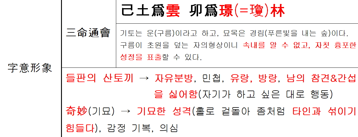 기묘일주에 기토는 운(구름)이라고 하고, 묘목은 경림(푸른빛을 내는 숲)이다. 기묘일주는 구름이 초원을 덮는 자의형상이니 속내를 알 수 없고, 자칫 흉포한 성정을 표출할 수 있다.